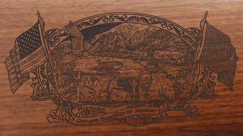 The right side of the American walnut buttstock is engraved with an intricate, original piece of artwork that captures the unique history of your county, while the left side is reserved for custom personalization.