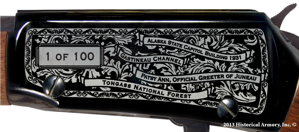 Finally, both sides of the receiver are engraved with an elaborate scroll and banner pattern. Each rifle is individually numbered on the left side of the receiver, for example an edition of 50 rifles would be numbered 1 of 50, 2 of 50 and so on.