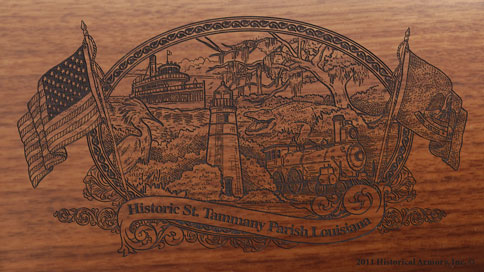 Detailed engraving on both sides of the American walnut forearm, with the name and establishment date of your parish on the right side and your state name and nickname on the left side.