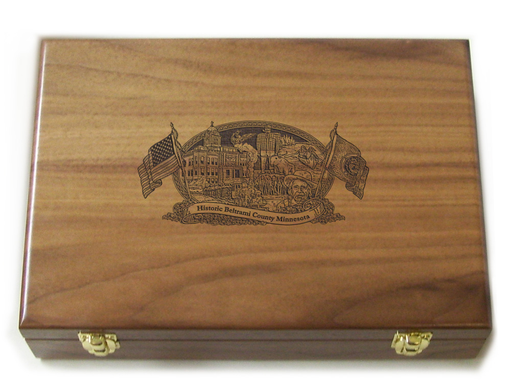 An American walnut presentation case. The case is engraved with an intricate piece of artwork that captures the unique history of your county, with the option of a personalization.