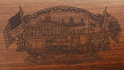 The right side of the American walnut buttstock is engraved with an intricate, original piece of artwork that captures the unique history of your county, while the left side is reserved for custom personalization.