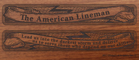 Detailed engraving on both sides of the American walnut forearm, with "The American Lineman" on the right side and "Lead us into the darkest storm and deliver us to serve those who depend on our skills." in the banner on the left side.