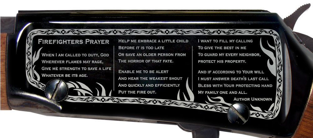 Finally, the left side of the receiver is engraved with the Firefighter's Prayer. The right side is reserved for a 3 line (20 character per line limit) custom personalization, which is included in the base price of the rifle. If you choose not to put a personalization on the receiver, a Maltese Cross will be engraved in that place.