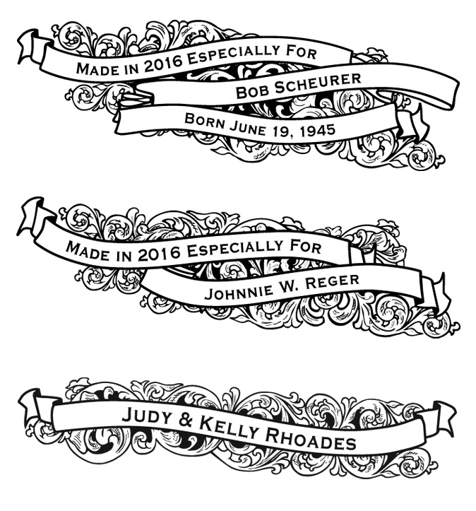 Personalization OptionsCustomize your rifle! Personalization is always available from Historical Armory. Personalizations are engraved on the left side of the stock. Use this space for family names, important dates, or heartfelt dedications. Make your rifle truly a “one-of-a-kind” or perhaps a special limited edition for your company or extended family. Personalizations can be up to 3 lines, 30-35 characters per line and are integrated into custom scroll work. This unique addition to your historical edition rifle is only . To personalize your rifle, call us now at 1-877-484-0179 or e-mail us at info@historicalarmory.com ![]() Logos and Custom ArtworkHistorical Armory can customize your rifle further with company logos, brands, or individualized artwork. We offer this service for an additional fee. |
