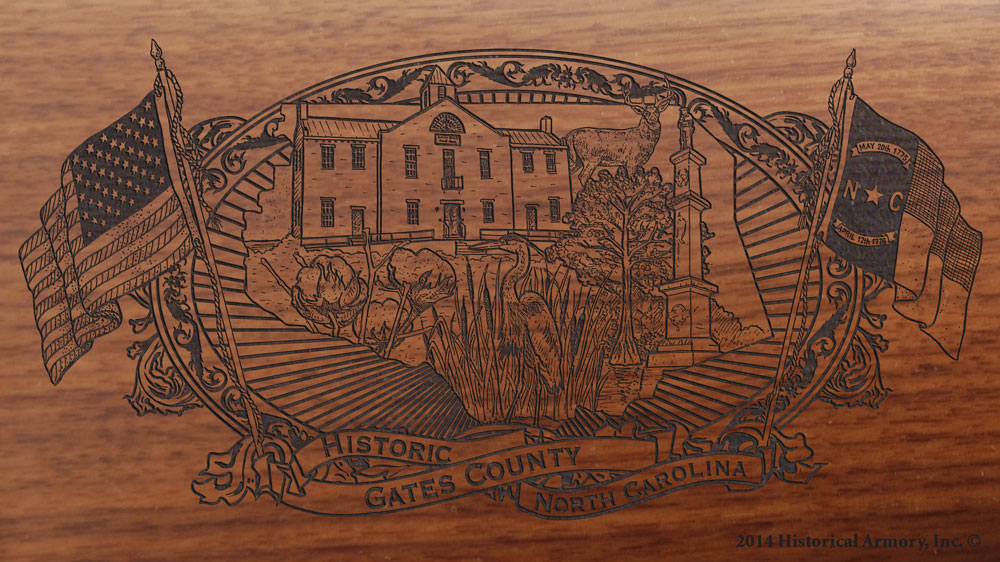 The right side of the American walnut buttstock is engraved with an intricate, original piece of artwork that captures the unique history of your county, while the left side is reserved for custom personalization.