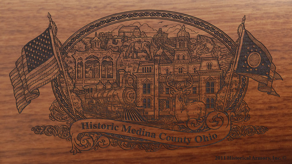 The right side of the American walnut buttstock is engraved with an intricate, original piece of artwork that captures the unique history of your county, while the left side is reserved for custom personalization.