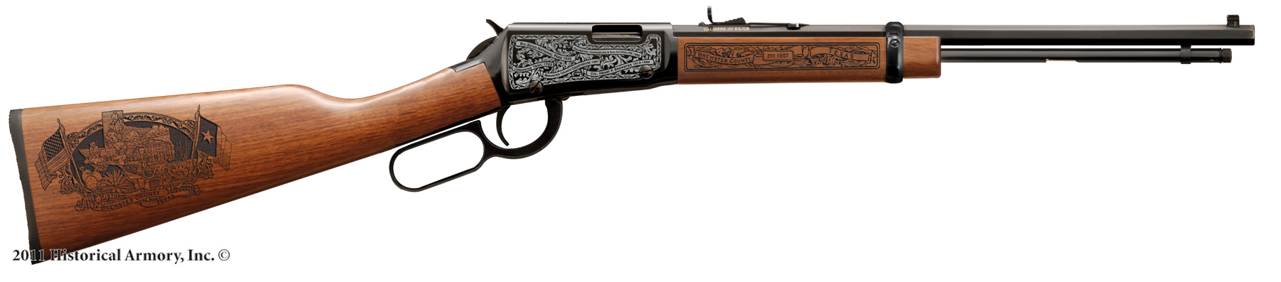 This County Historical Edition Rifle is available on the Rossi Stainless Steel R92 (.44 Mag, .45 Colt, .38/357), the American-made Henry LR. 22 (H001T), Golden Boy (H004) and .30/30 (H009B) and features the following: