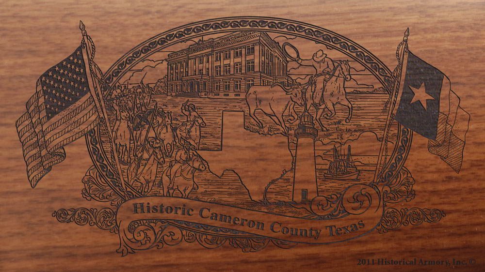 • The right side of the American walnut buttstock is engraved with an intricate, original piece of artwork that captures the unique history of your county, while the left side is reserved for custom personalization.