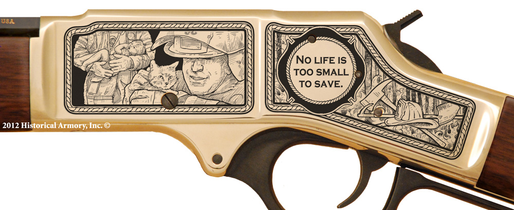 This year's annual edition is limited to only 25 edition numbers per state on models H004 Golden Boy .22 and the H009B 30-30, both made in America by Henry Repeating Arms Company. (North Dakota, Ohio, Oklahoma, Texas, and Utah have an edition size of only 10 numbers.) Your rifle will be engraved with original art depicting our 2012 theme "No Life Is Too Small to Save" on the butt stock and the receiver, including a Maltese Cross. The forearm stock will be engraved with your specific state on one side and "2012 Authentic American Heroes" engraved on the other.