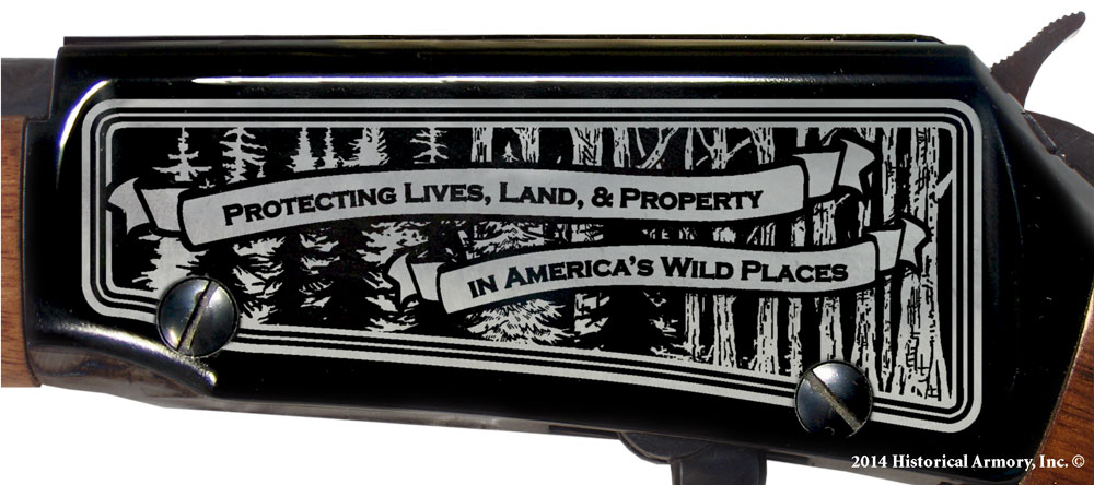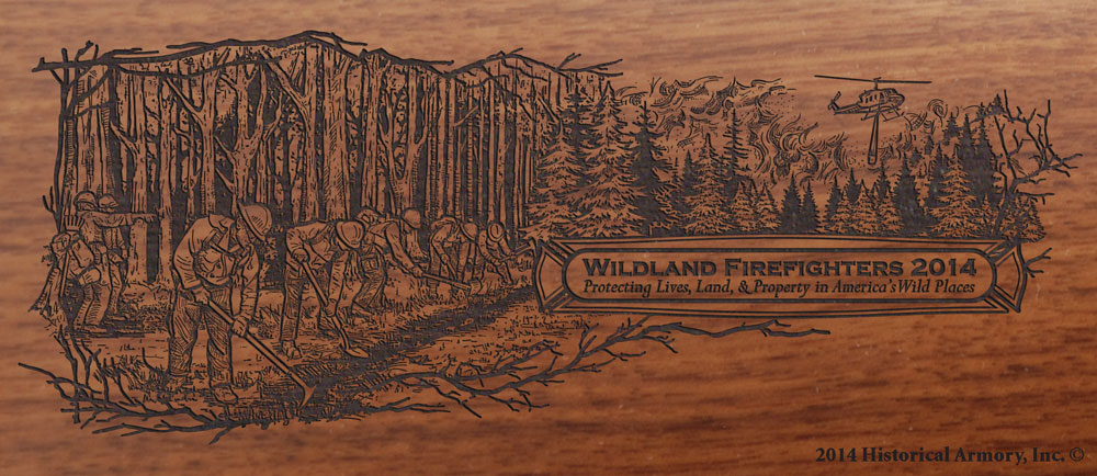 The right side of the American walnut buttstock is engraved with an intricate, original piece of artwork that depicts the 2014 theme "Wildland Firefighters".