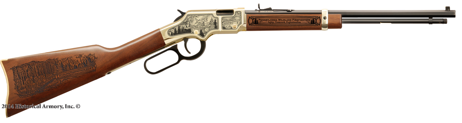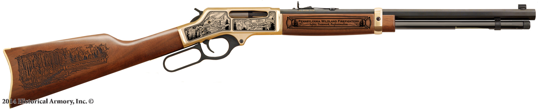 This year's annual edition is limited to only 25 edition numbers per state on models H001, H004 Golden Boy .22 and the H009B 30-30, all made in America by Henry Repeating Arms Company. Your rifle will be engraved with original art depicting our 2014 theme "Wildland Firefighters" on the butt stock and both side of the receiver. The forearm stock will be engraved with your specific state on one side and "Fighting Fire with Fire - The Best Never Rest" on the other.