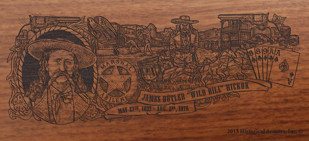 The right side of the American walnut buttstock is engraved with an intricate, original piece of artwork featuring images honoring the life of Wild Bill Hickok, while reserving the left side of the buttstock for custom personalization.